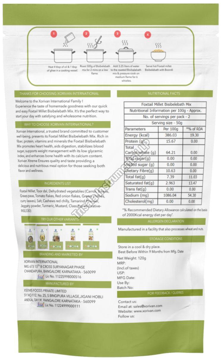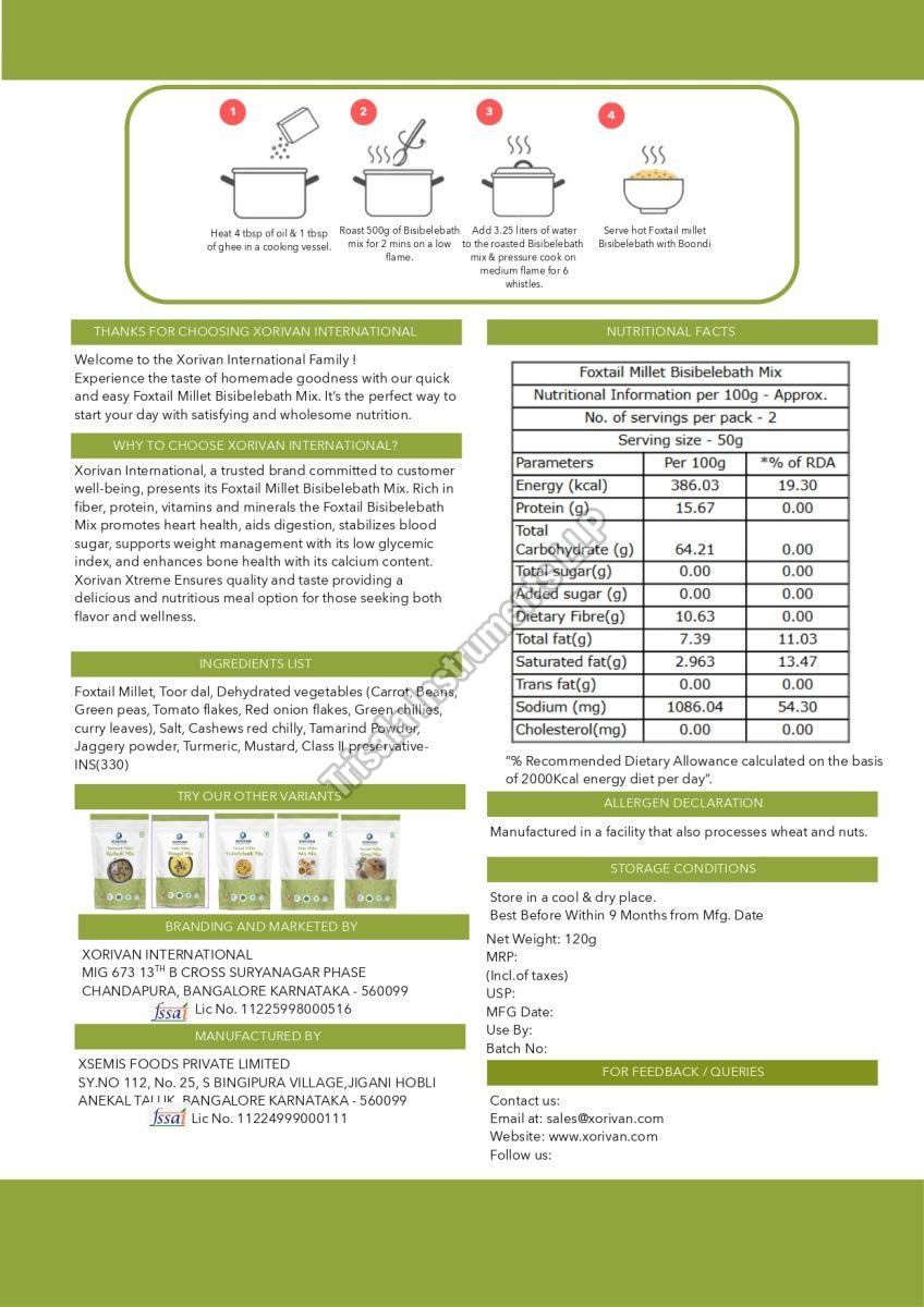 A healthy twist on the traditional South Indian delicacy, our Foxtail Millet Bisibelebath Mix combines the goodness of foxtail millet with aromatic spices, lentils, and tamarind. It offers a quick, wholesome, and flavorful meal packed with fiber, protein, and essential nutrients — perfect for modern, health-conscious consumers.