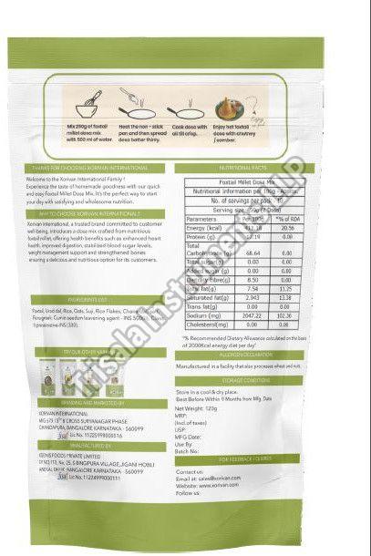 We offer a premium Foxtail Millet Dosa Mix certified by FSSAI, sourced from India. Our mix is perfect for preparing healthy dosas, made with high-quality ingredients including Urad Dal. Each pack weighs 120g and has a shelf life of 6-12 months. Store in an airtight container for freshness. Ideal for exporters, suppliers, and traders looking to provide a nutritious and convenient dosa solution to their customers.